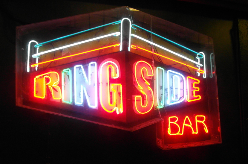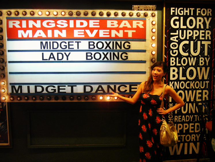 ▲在 Ringside Bar 門口拍照留念,看板上還寫上當天的表演節目,除了有侏儒打拳擊之外,還有女力打拳擊,增加了不少娛樂效果。