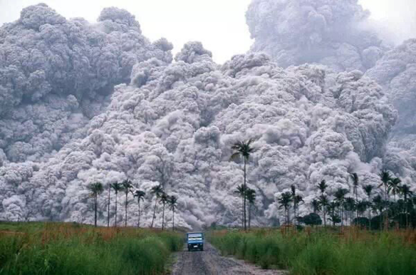 ▲ 菲律賓攝影師 Alberto Garcia 捕捉到一輛小型卡車正從噴發的皮納圖博火山腳下倉皇而逃,宛如電影場景一樣驚險,此照片也被譽為20世紀最偉大的影像之一。 (http://globalnation.inquirer.net/14995/images-of-pinatubo-20-years-later)