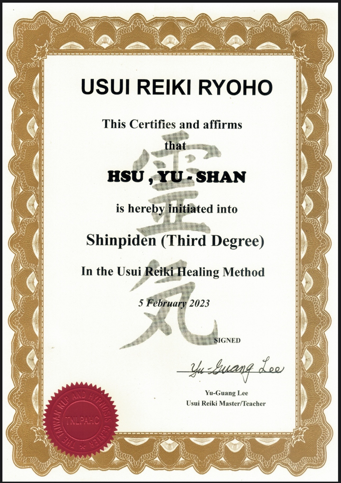 作為第 8 代傳承者,擁有完整清晰的 Usui Reiki lineage,從創始人一路到現代,保留了最純粹的教學與能量系統。